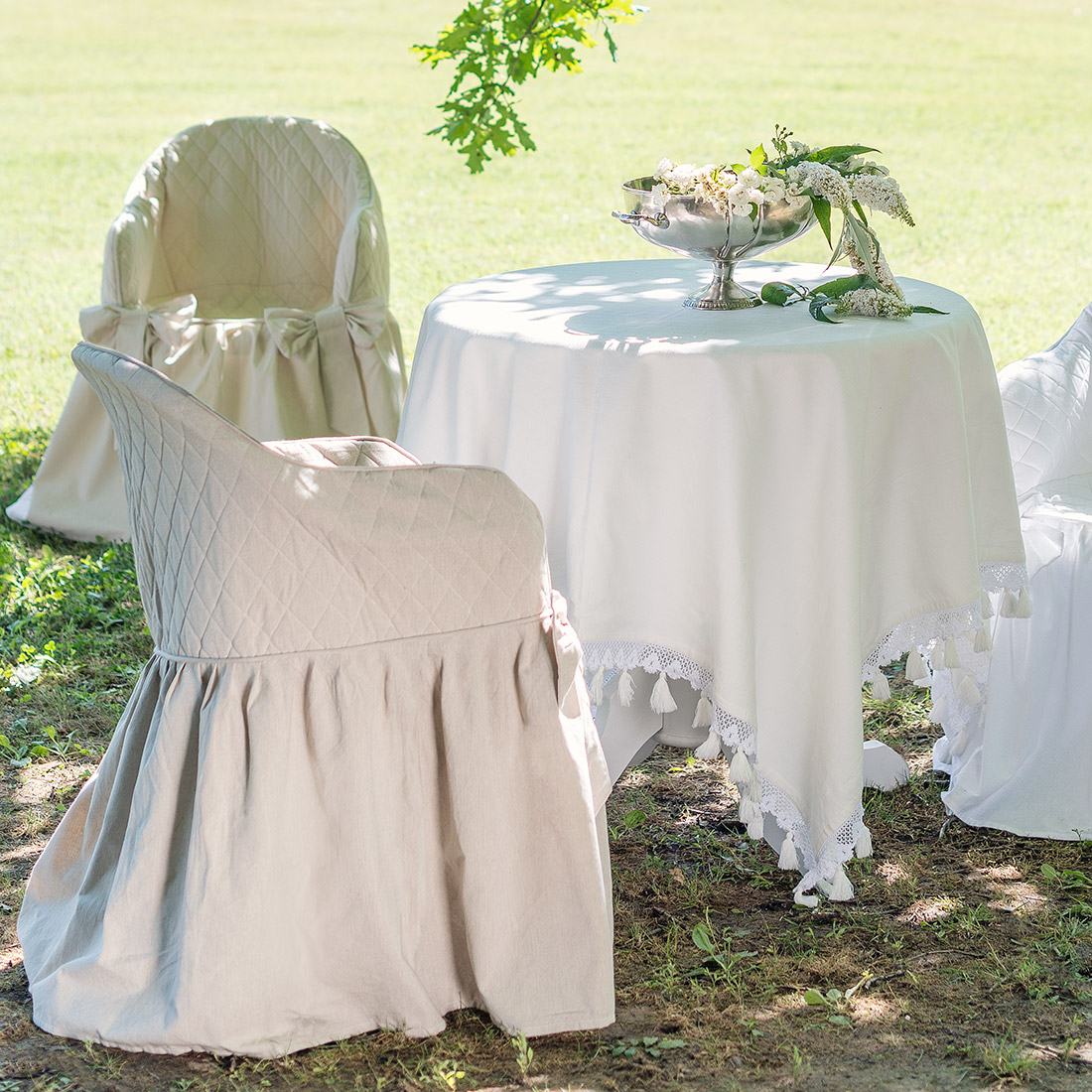 Per le sedie di plastica dallo schienale stondato, invece, puoi usare i vestisedia Garden nei colori naturali. La leggera imbottitura nelle zone dello schienale, della seduta e dei braccioli, i due fiocchi decorativi e la balza di tessuto fino a terra, le renderanno irriconoscibili: delle vere e proprie poltroncine country chic per la terrazza o il giardino. E quando la bella stagione sarà finita, potrai spostare una o più poltroncine dentro casa oppure sfilare i vestisedia, lavarli con facilità e riporli nell’armadio della biancheria fino a una nuova primavera estate.